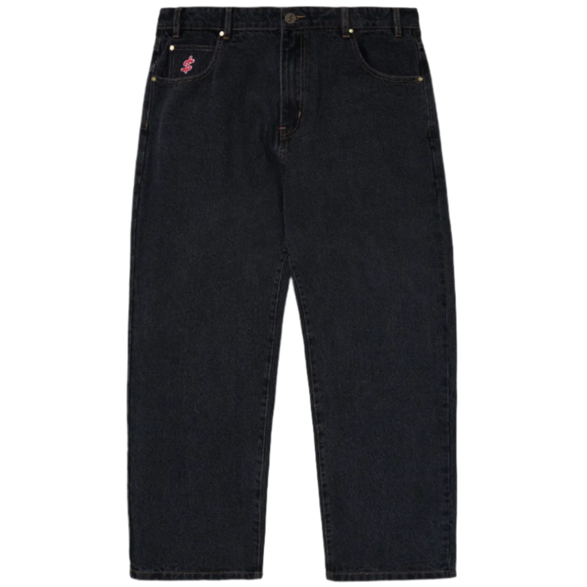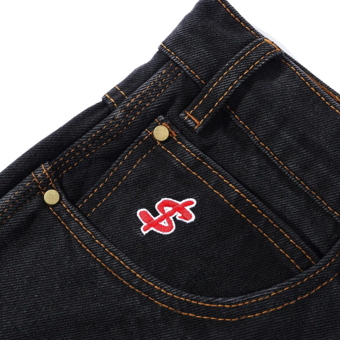 - Baggy denim jeans with slight taper - Contrast gold stitching - Embroidered logo on front coin pocket - Embroidery across both back pockets - Brass logo button with zip fly closure - Drawstring on internal waist band - PU label on back waist band