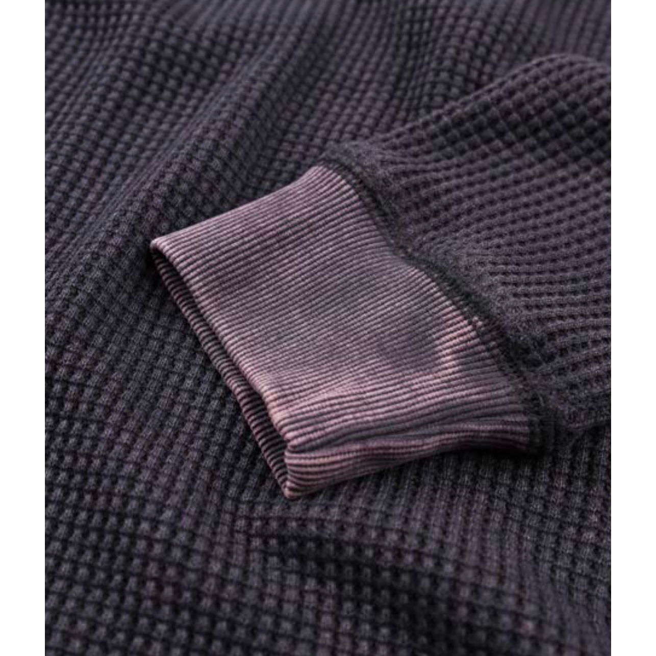 Vintage-inspired long sleeve waffle knit tee in acid black with embroidered Franchise F logo. Crafted from a breathable 65% polyester, 35% cotton blend, this piece features classic waffle texture and a relaxed fit perfect for everyday wear.