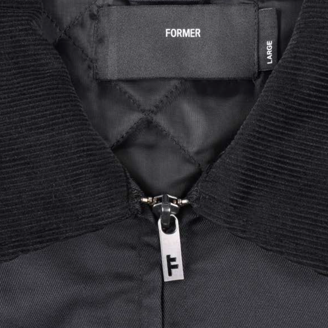 Former Reynolds Jacket in durable twill blend with a classic cage fit. Features front graphic with satin-stitch embroidery, contrast corded collar, and metal shank button cuffs. Quilted body lining and welt pockets provide comfort and functionality. Pre-washed for a broken-in feel.